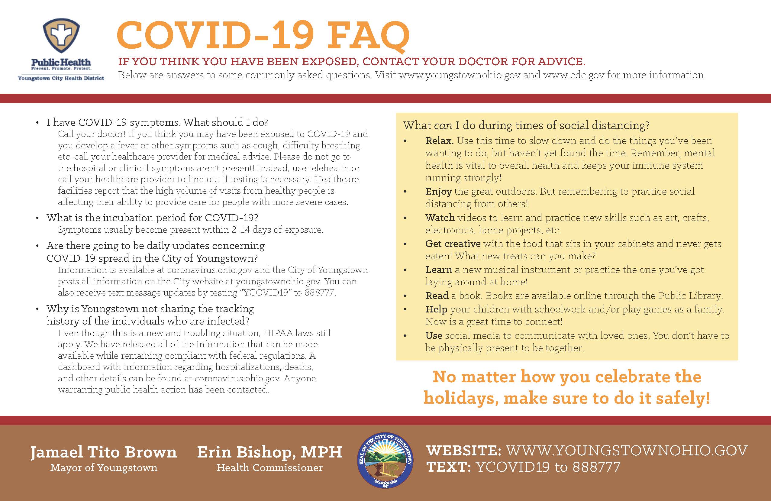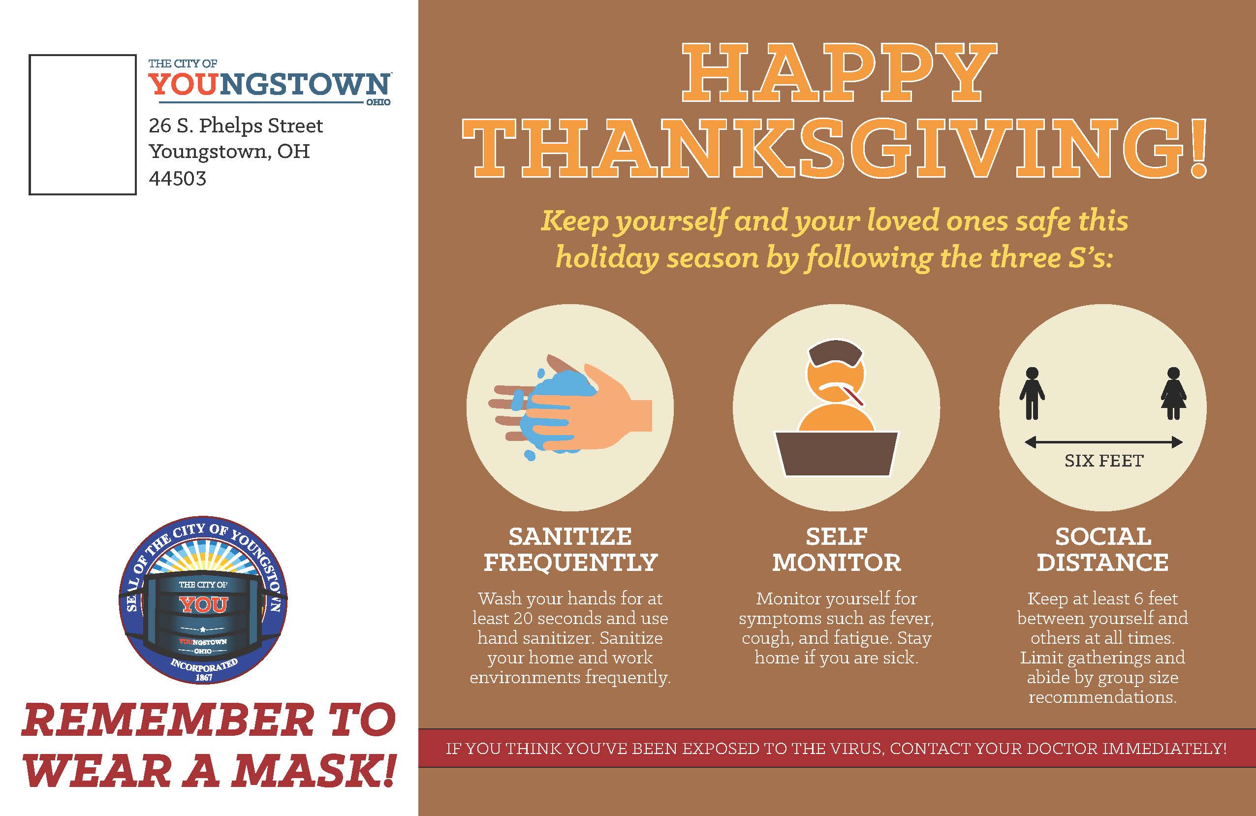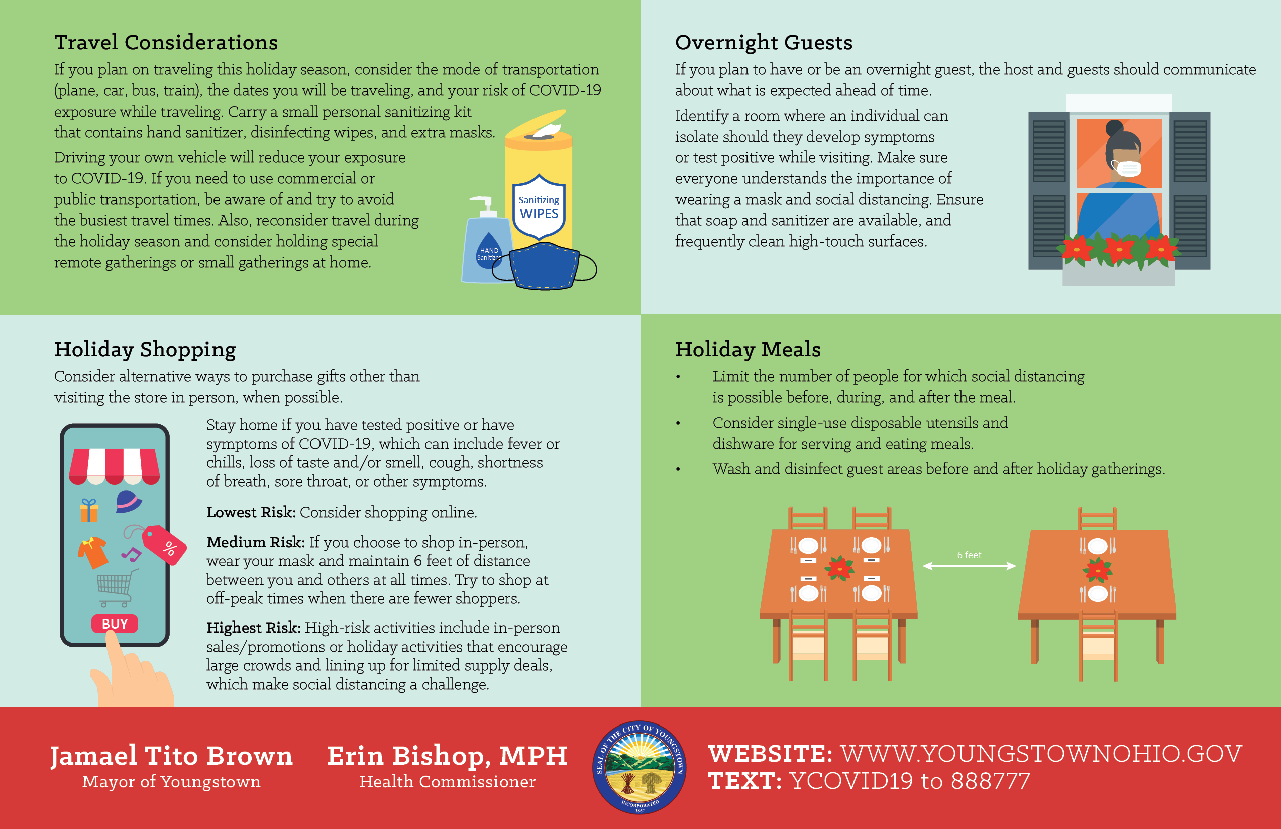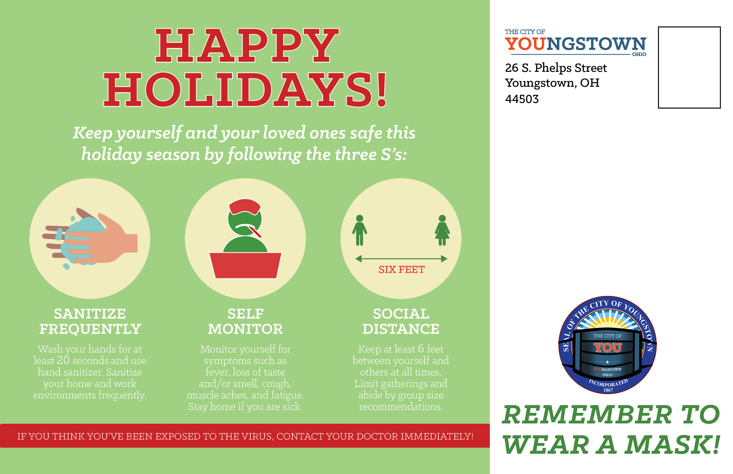 I designed mailers for the City of Youngstown while employed with Economic Action Group, Inc. The purpose of the mailers was to inform Youngstown residents about COVID-19 and strategies for safely celebrating the holiday season during the COVID-19 pandemic. The project involved research, illustration, content writing, and layout design. Additionally, I packaged the design for printing and worked with a local printing service to have them made. The mailers were distributed to residents of the City of Youngstown in both November and December 2020.