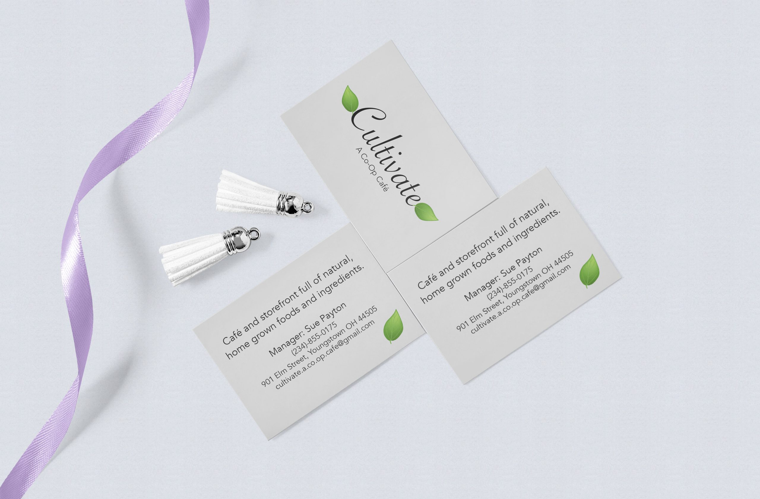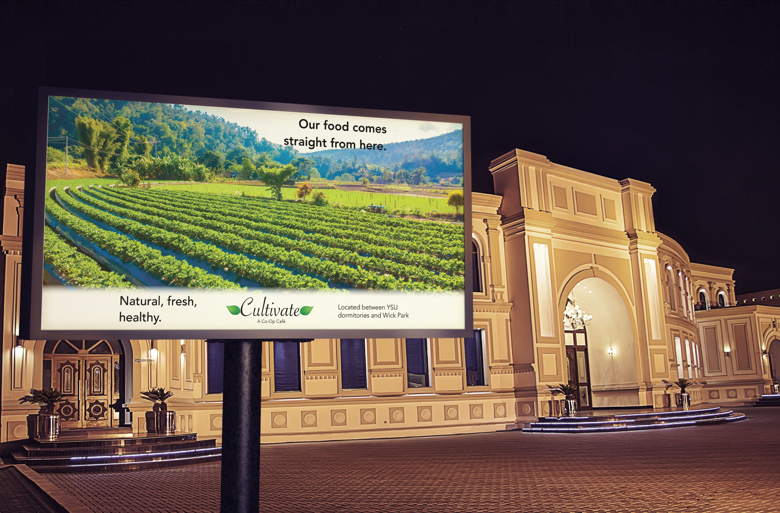 In my Intermediate Graphic Design class at Youngstown State University, I was tasked with creating a mock rebranding campaign for a local business. I chose Cultivate Café for the project and created a logo, business card, menu, and various ads for both digital and print purposes. I met with the owners of Cultivate Café to discuss the project and gather insight on what they feel is important when advertising the cafe. The main detail I decided to emphasize was the natural sources of the items they sold. I utilized the tagline “natural, fresh, healthy” in most of the ads I created.