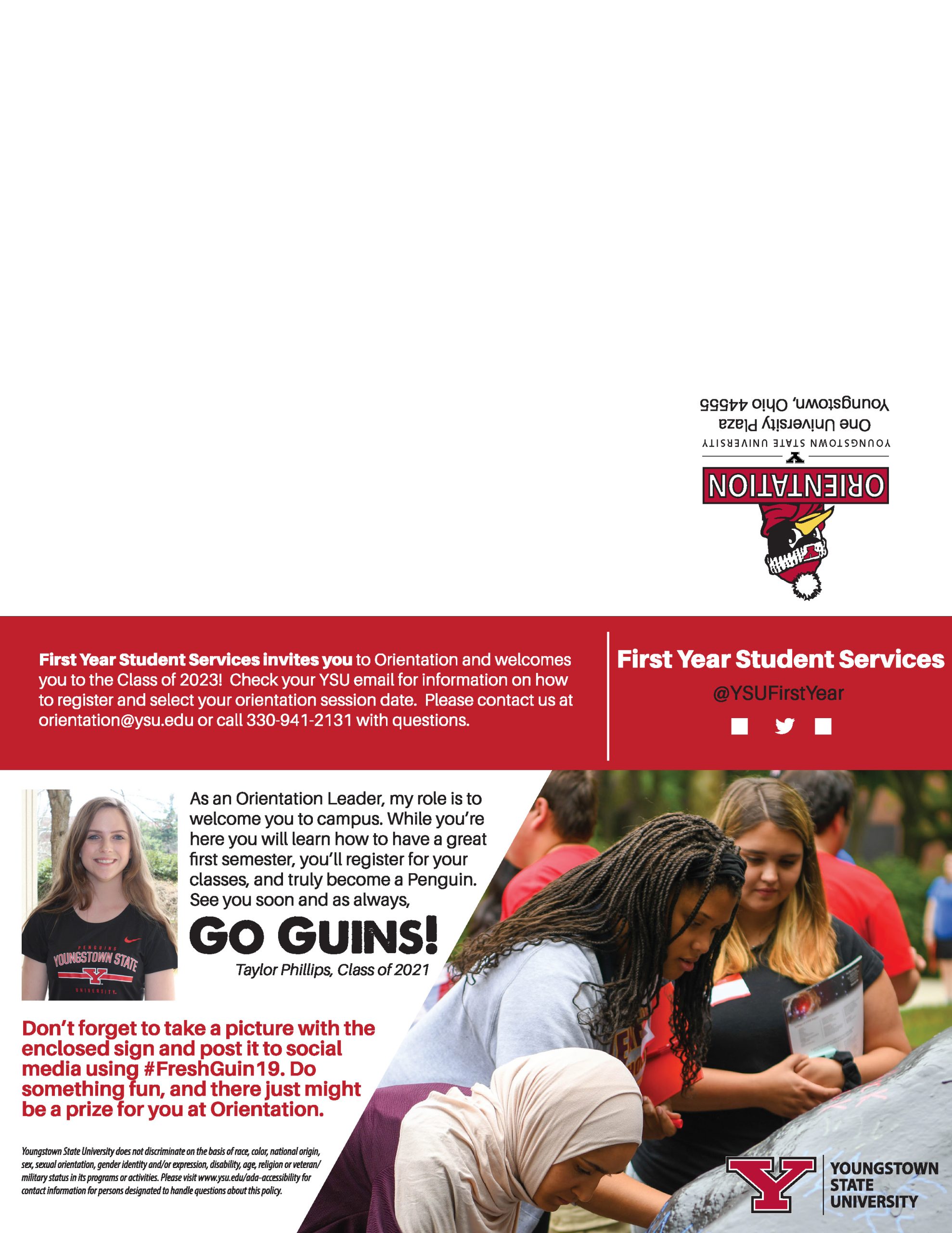 I made this mailer for First Year Student Services to send to students who had already been accepted to YSU and were starting in the Fall 2019 semester. The purpose of the hashtag was so that the students could take selfies with the mailer and post them on social media. We wanted to boost school spirit and engage with students so they’d be excited to start school in the fall.