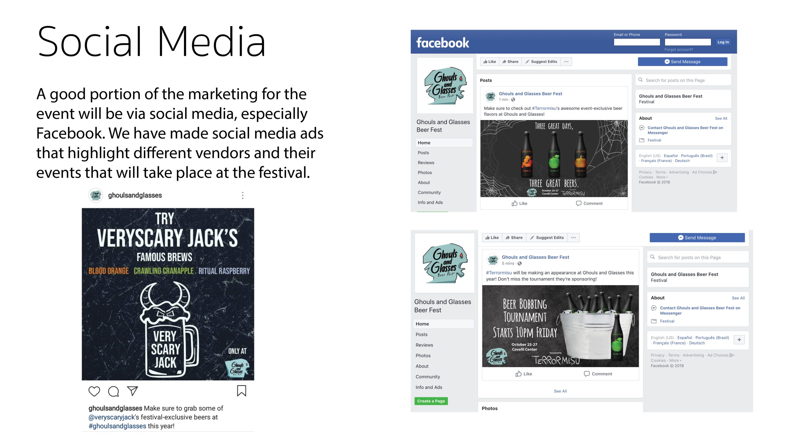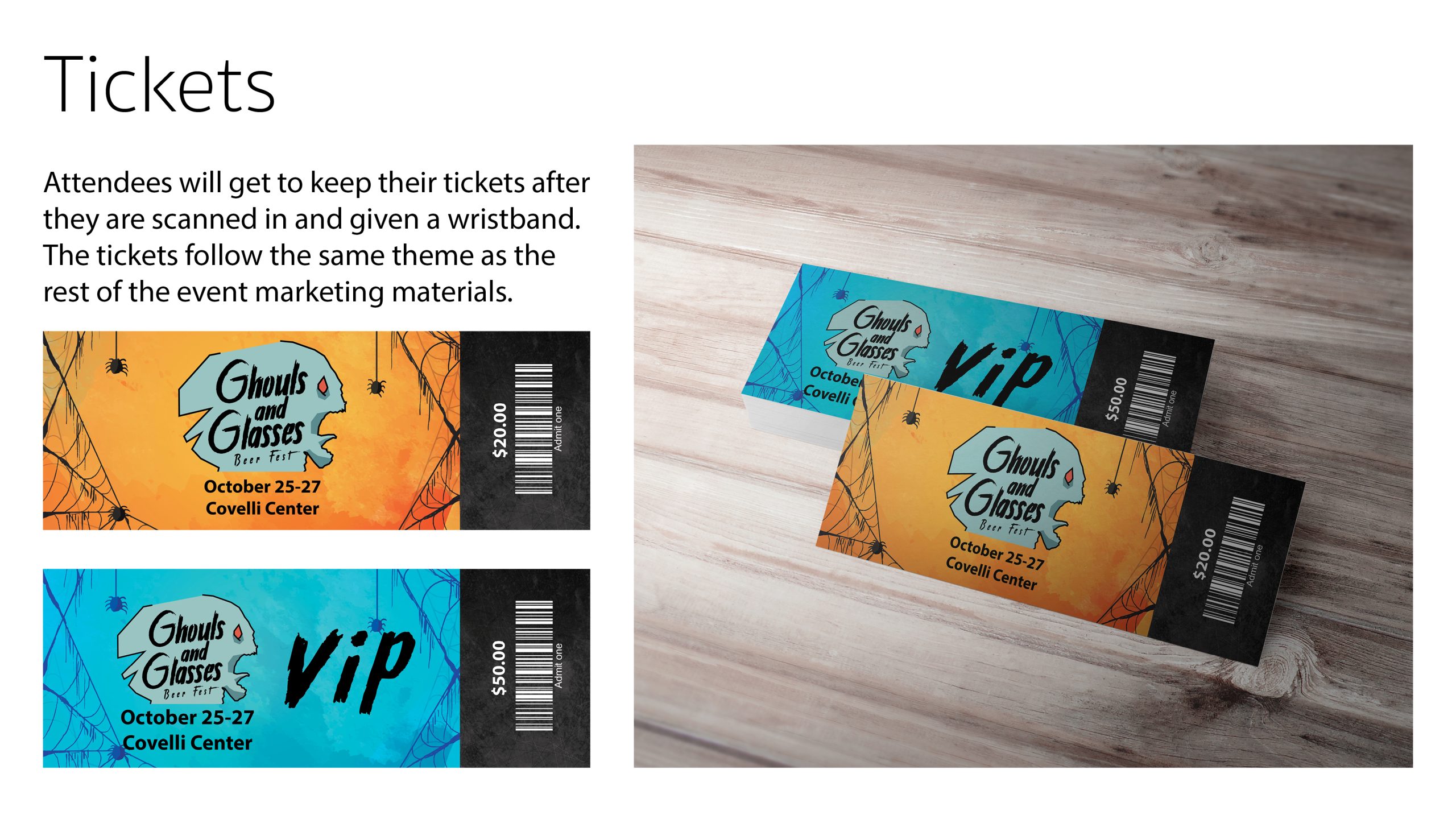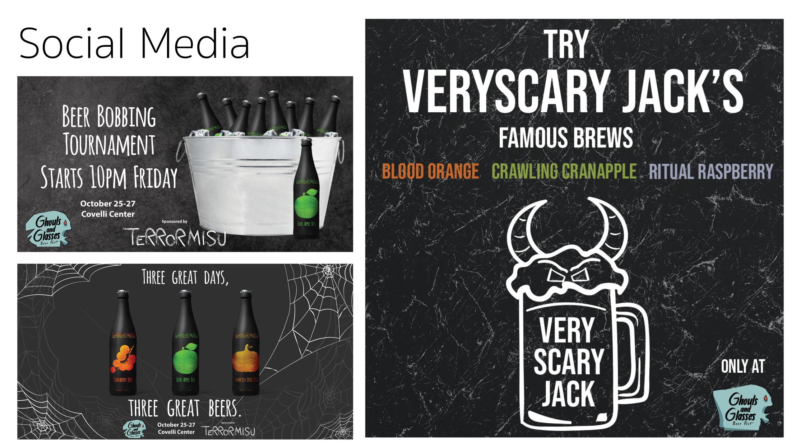 In my Intermediate Graphic Design course at Youngstown State University, we were assigned a group project that was meant to emulate working on a real event in the graphic design industry. We were tasked with planning and branding, from the ground up, a fictional beer festival. My group came up with Ghouls and Glasses, a Halloween-themed beer festival. We featured beer bottle designs from several group members’ previous projects, including from my food truck project, Terrormisu. We designed multiple deliverables, including tickets, staff passes, social media ads, posters, and more. Additionally, we did a formal marketing plan proposal at the end of the semester, which included all of our finalized designs and a budget proposal, to several members of the university’s graphic design faculty.Â