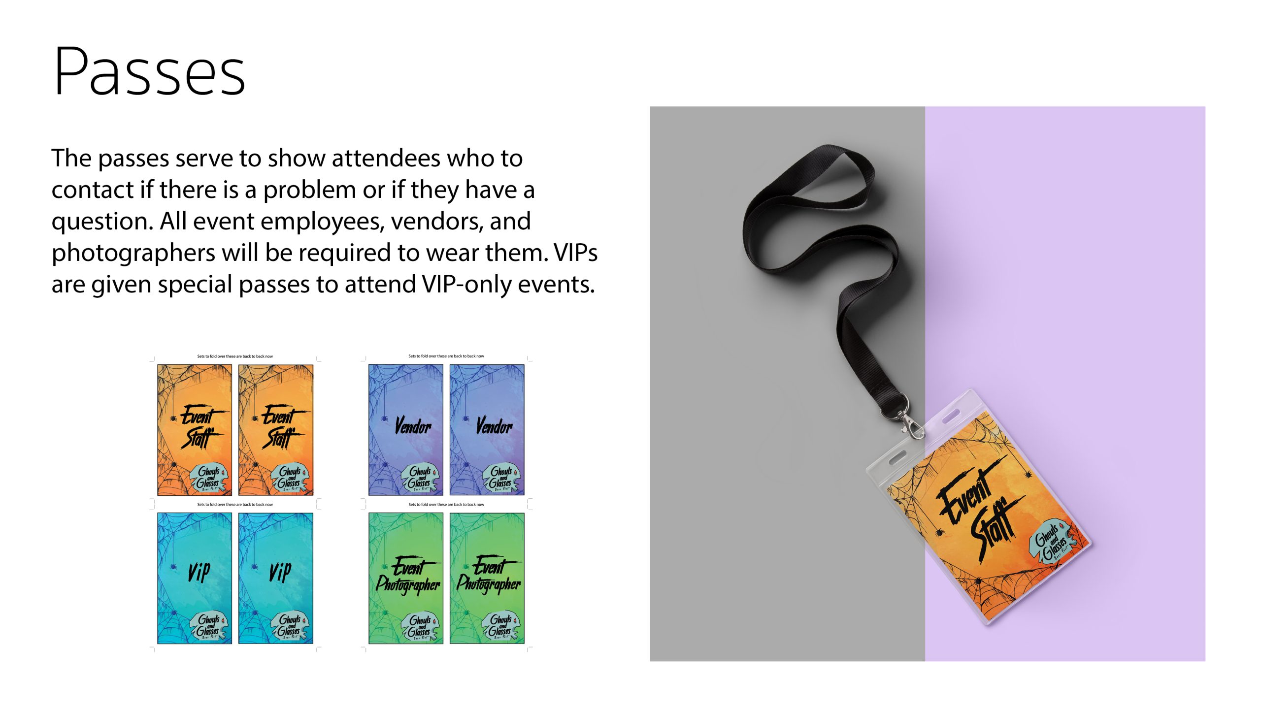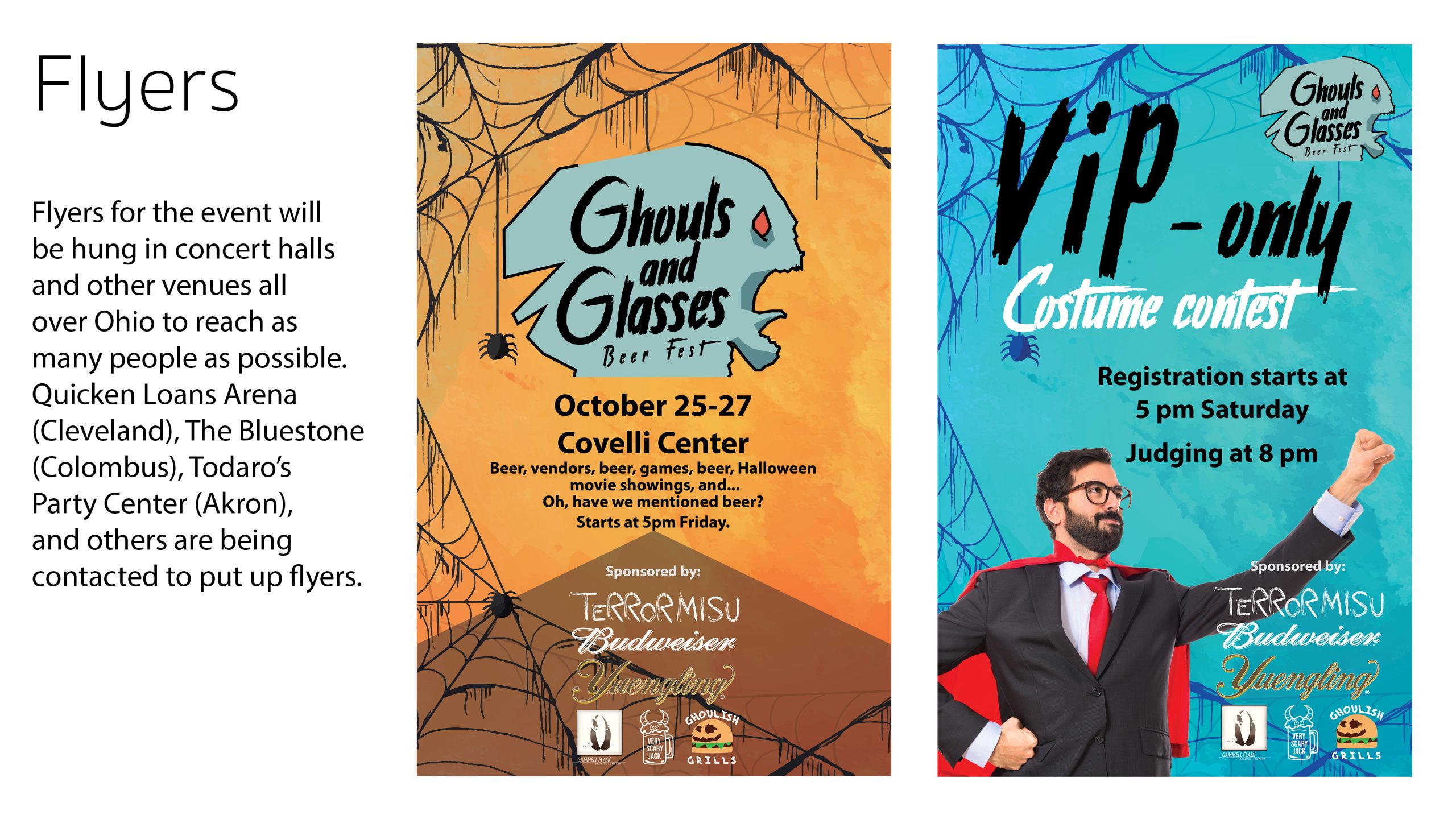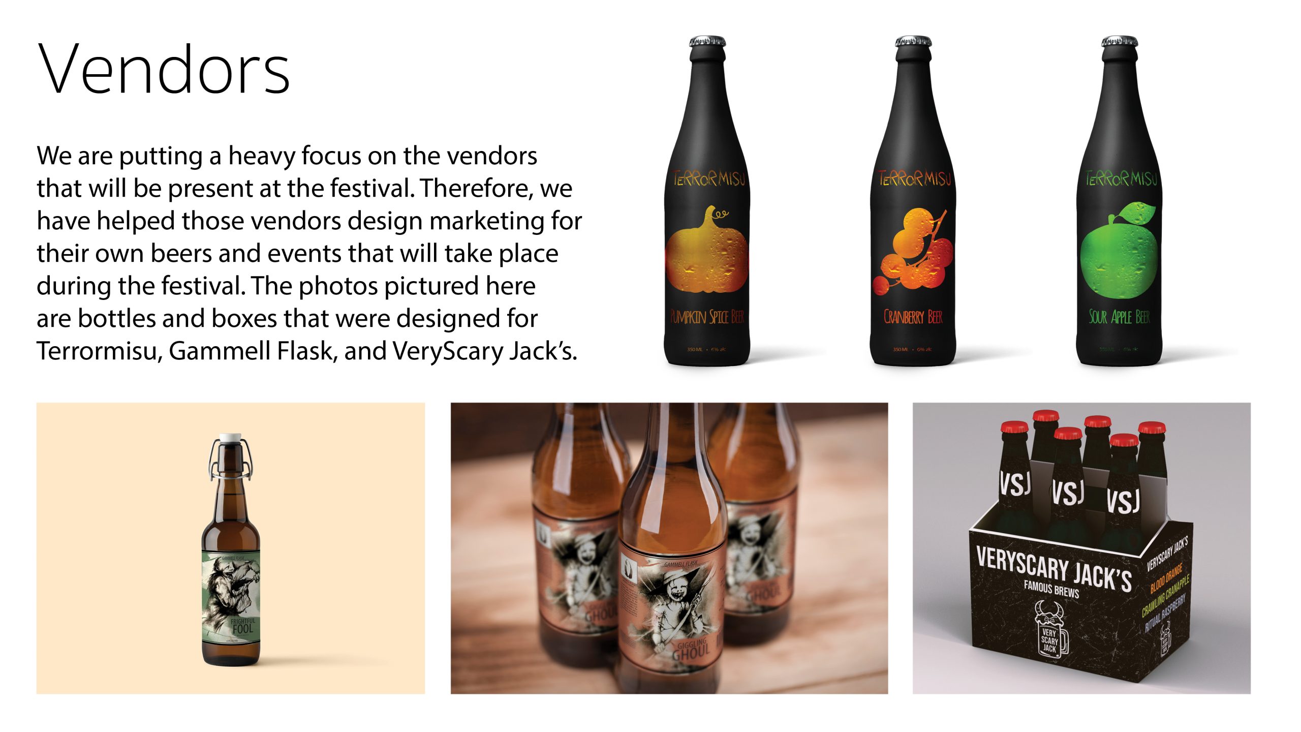 In my Intermediate Graphic Design course at Youngstown State University, we were assigned a group project that was meant to emulate working on a real event in the graphic design industry. We were tasked with planning and branding, from the ground up, a fictional beer festival. My group came up with Ghouls and Glasses, a Halloween-themed beer festival. We featured beer bottle designs from several group members’ previous projects, including from my food truck project, Terrormisu. We designed multiple deliverables, including tickets, staff passes, social media ads, posters, and more. Additionally, we did a formal marketing plan proposal at the end of the semester, which included all of our finalized designs and a budget proposal, to several members of the university’s graphic design faculty.Â